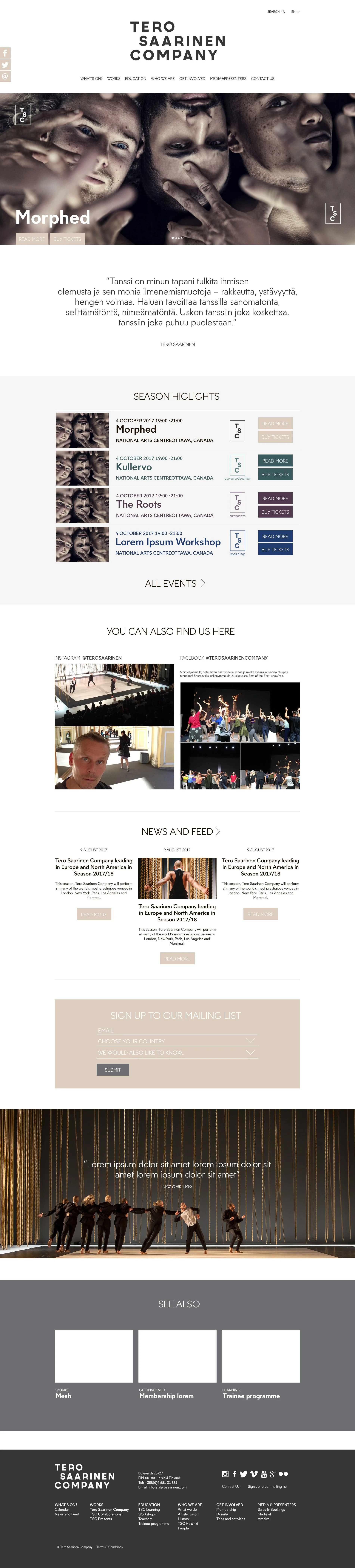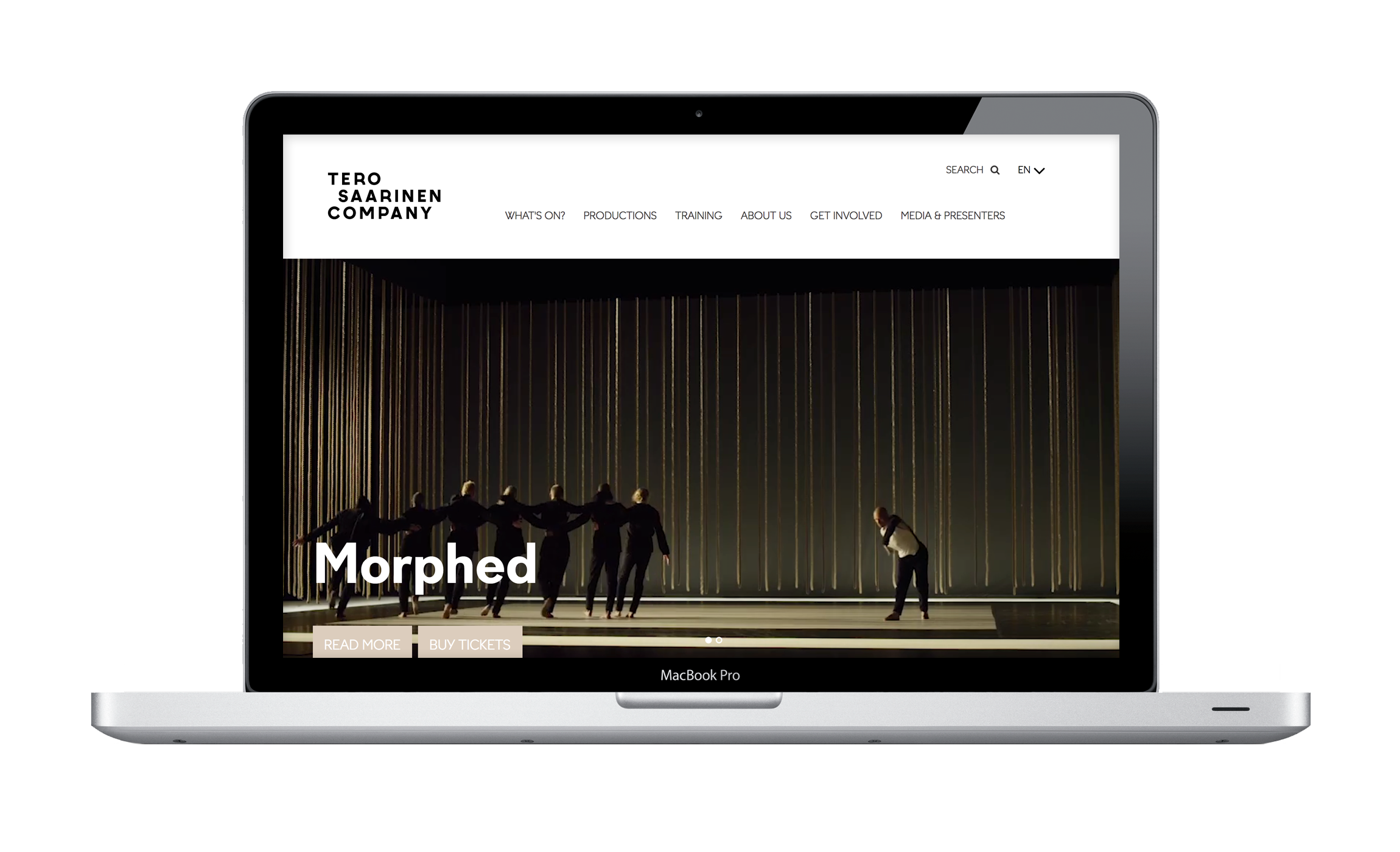 Tero Saarinen Company's visual identity underwent a complete transformation in 2018. We revamped the dance group's logo, signature colors, and aligned the use of typography. On the new site, the dance works take center stage as large image surfaces and video loops.